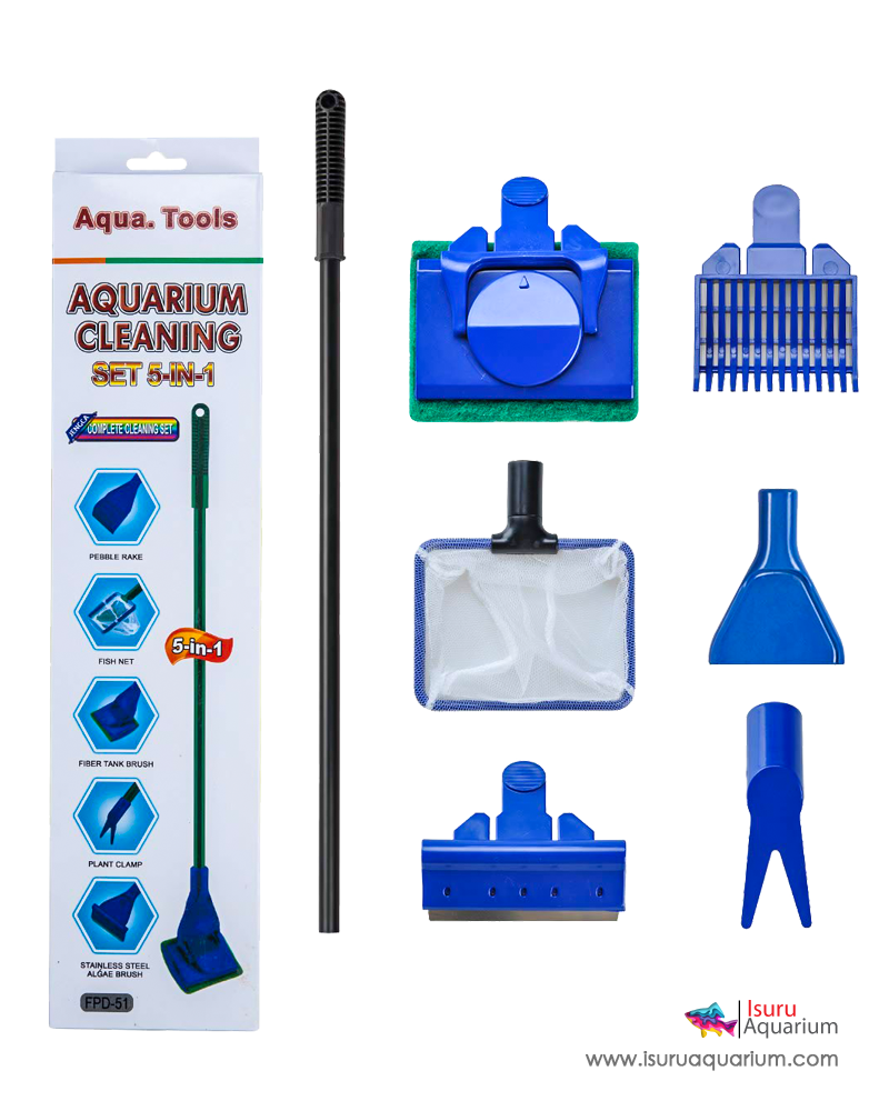 - The 5 accessories, a fish net, an algae scraper, a window sponge,a plant fork and a gravel rake.